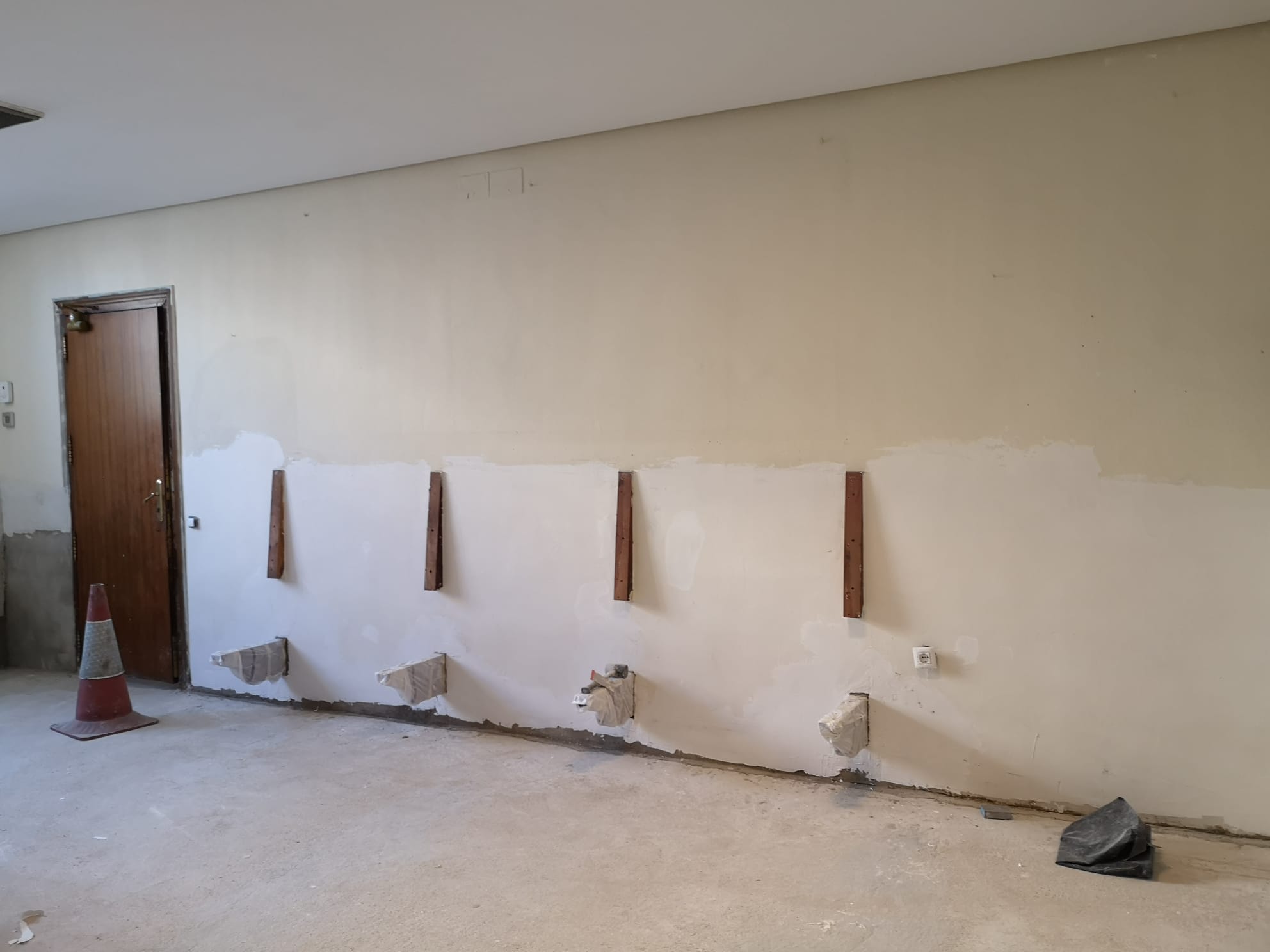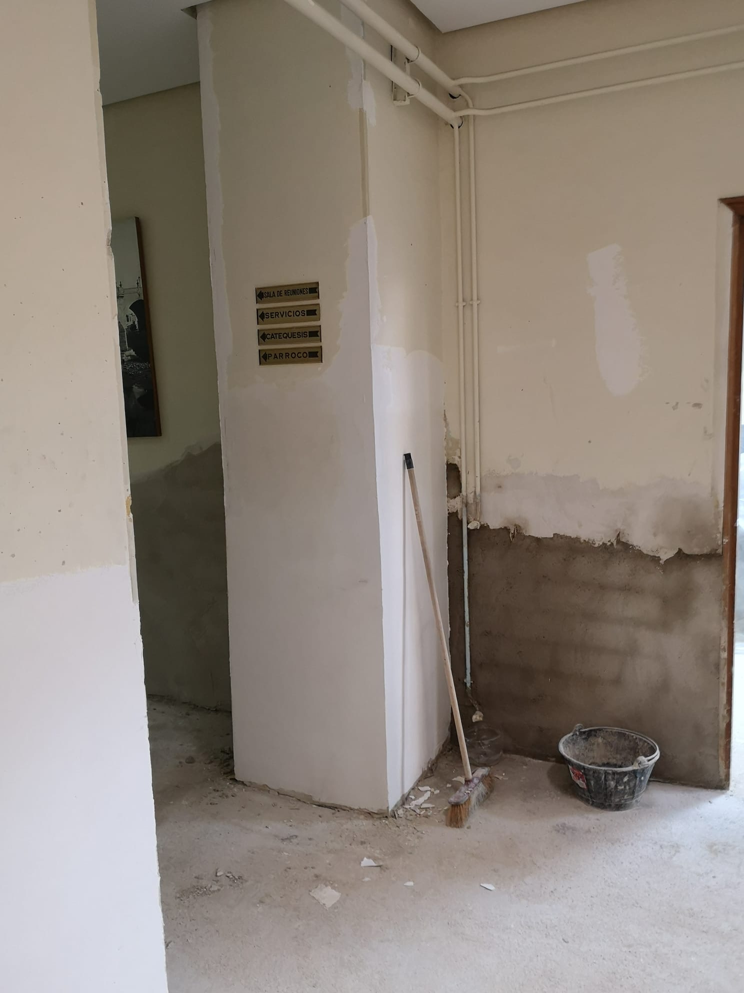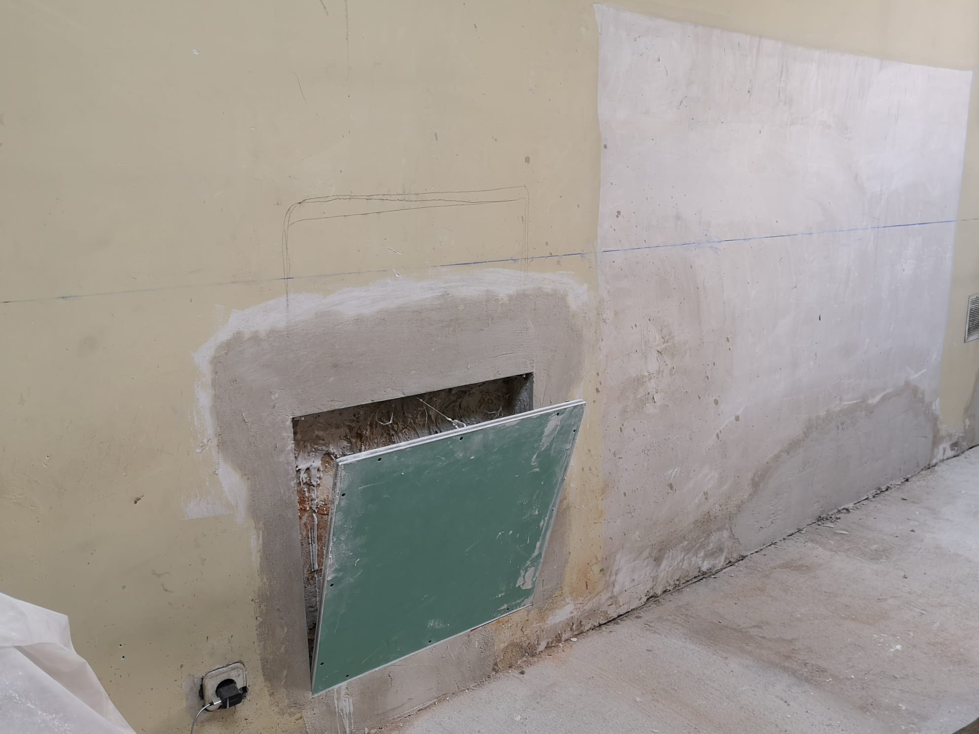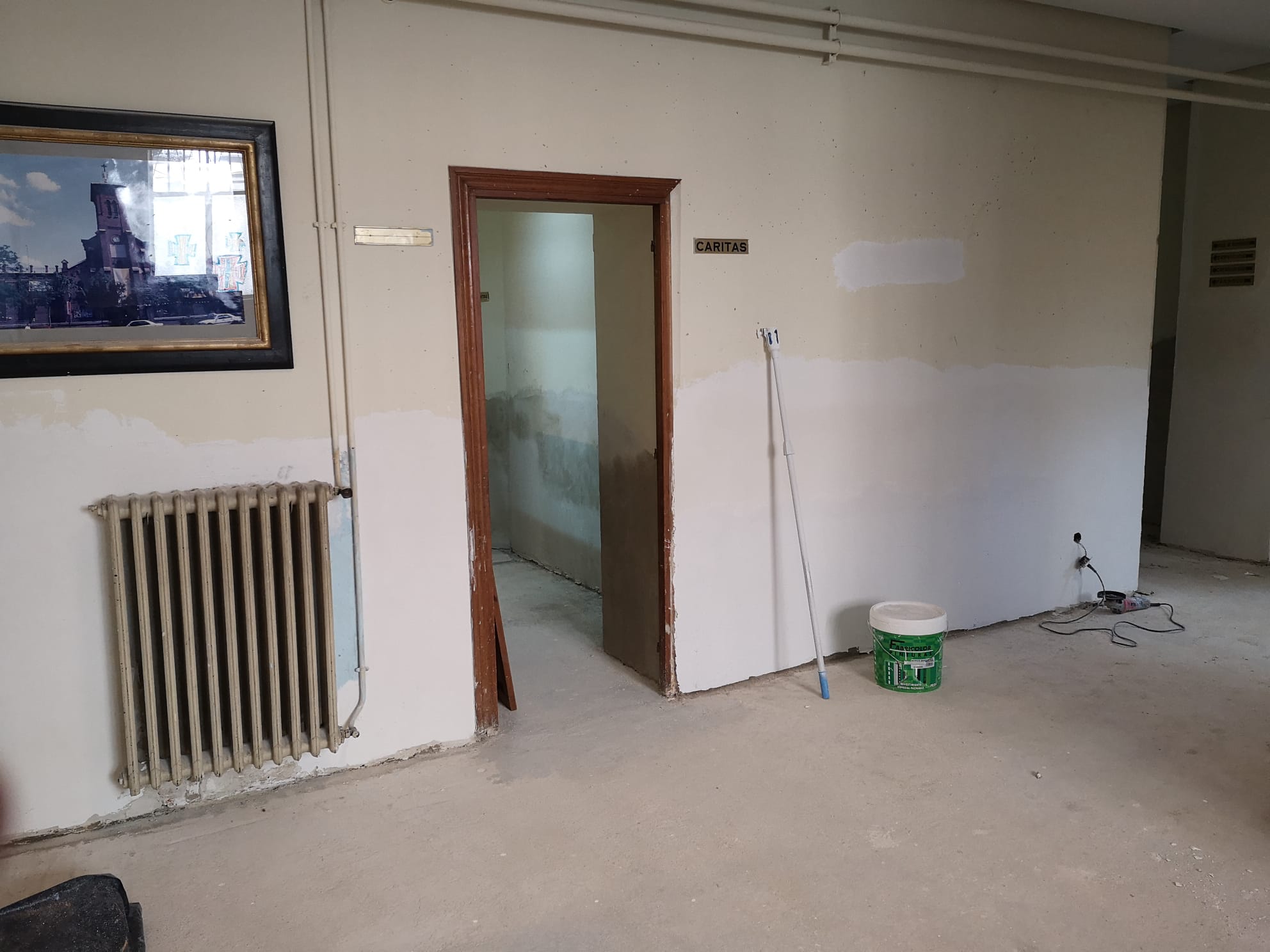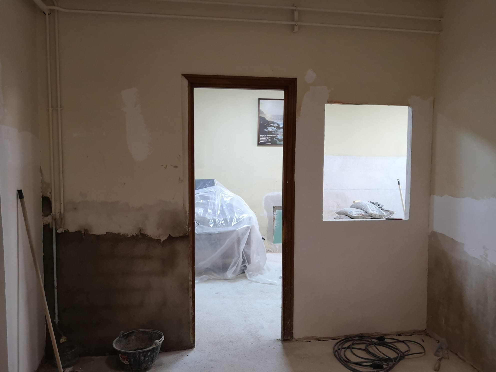 - Las paredes deterioradas por la humedad se están arreglando, quitándose el azulejo que se estaba cayendo, enyesando o rellenando con cemento, y se han hecho trampillas de control y ventilación, de modo que están preparadas para pintura.