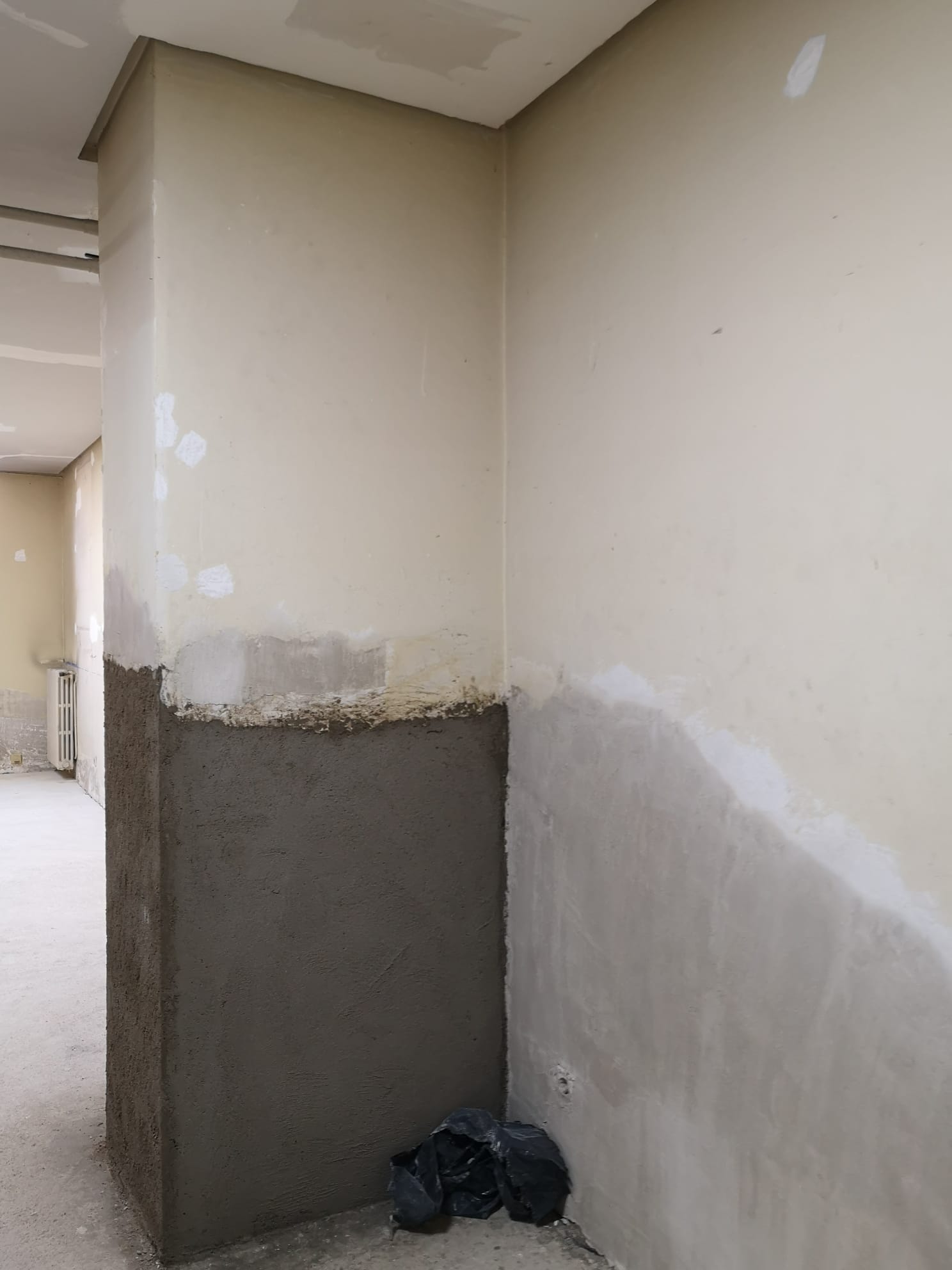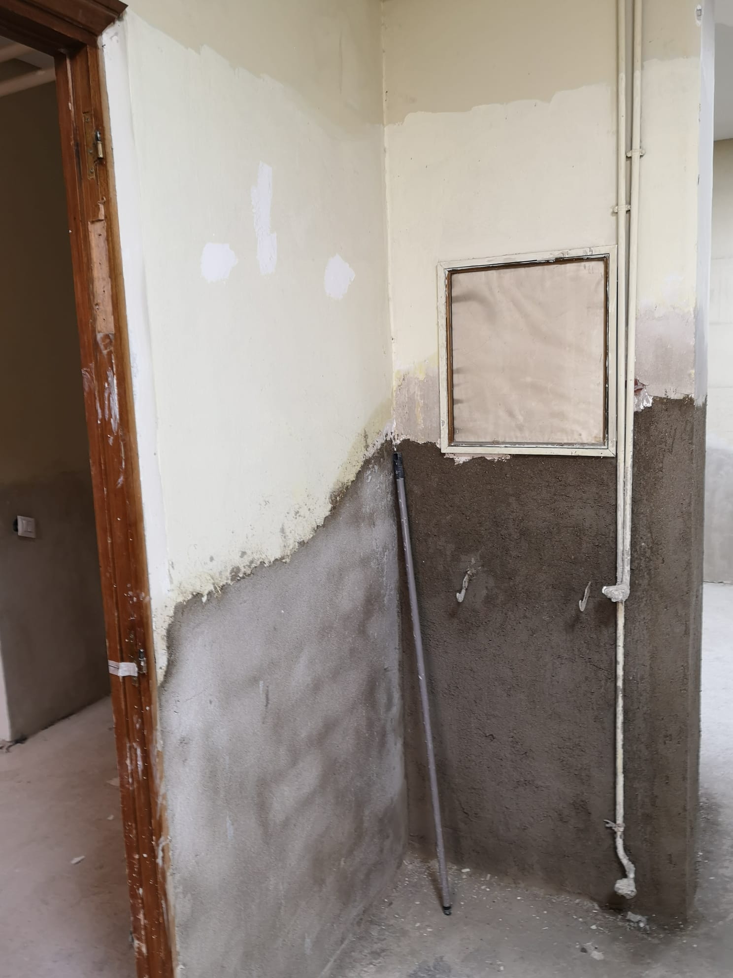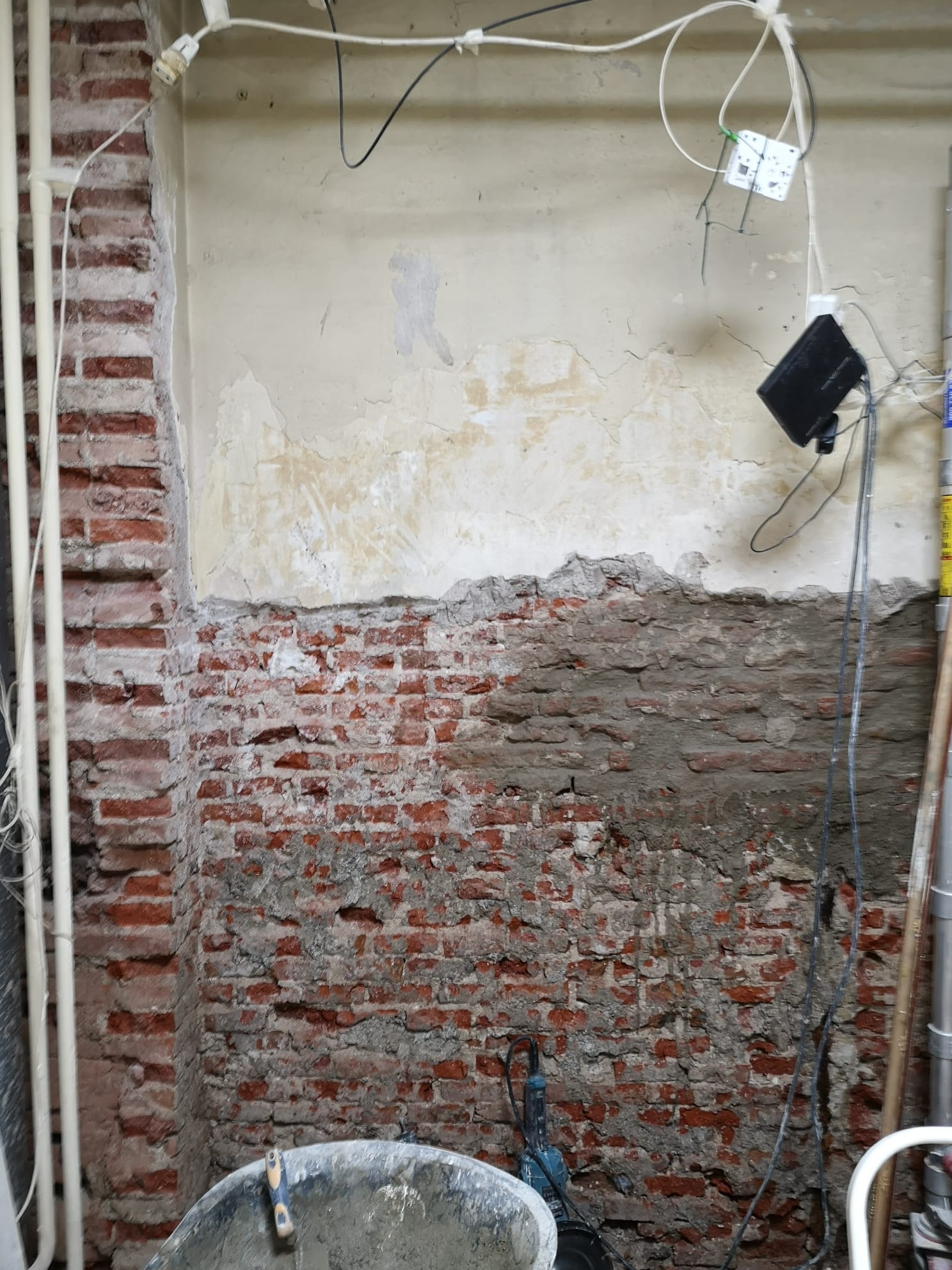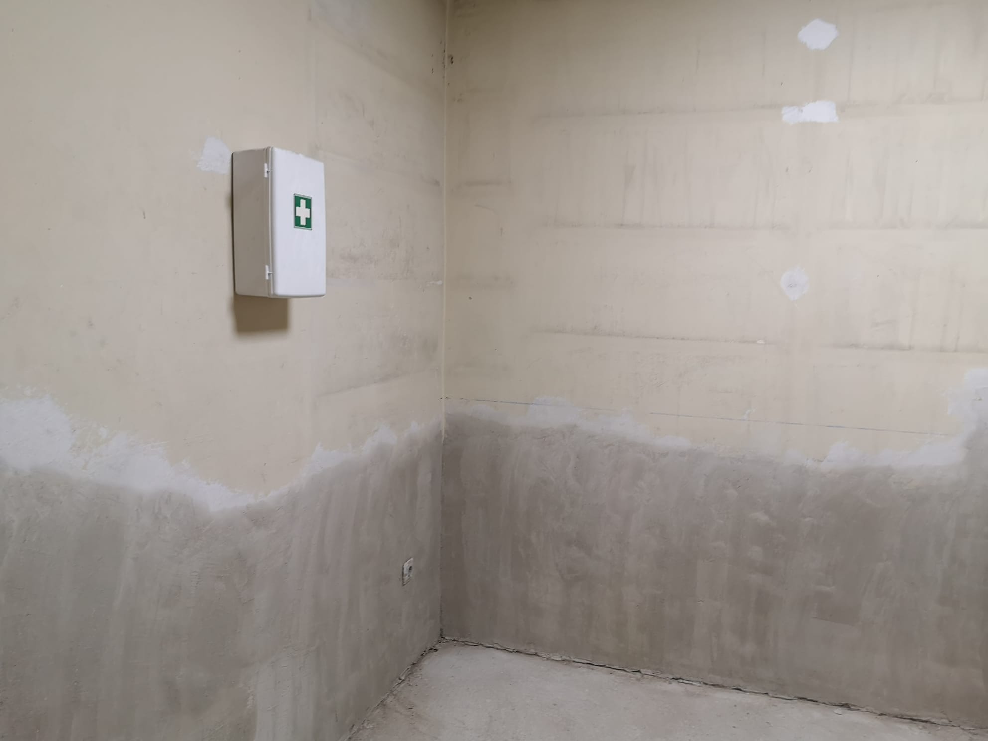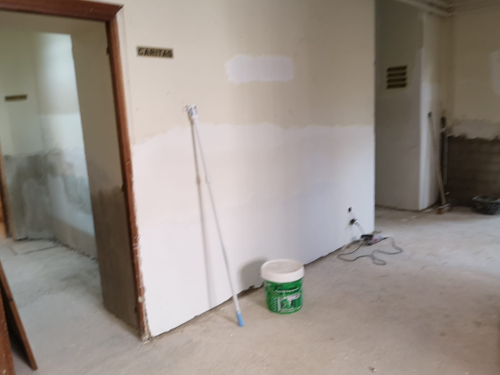 - Las paredes deterioradas por la humedad se están arreglando, quitándose el azulejo que se estaba cayendo, enyesando o rellenando con cemento, y se han hecho trampillas de control y ventilación, de modo que están preparadas para pintura.
