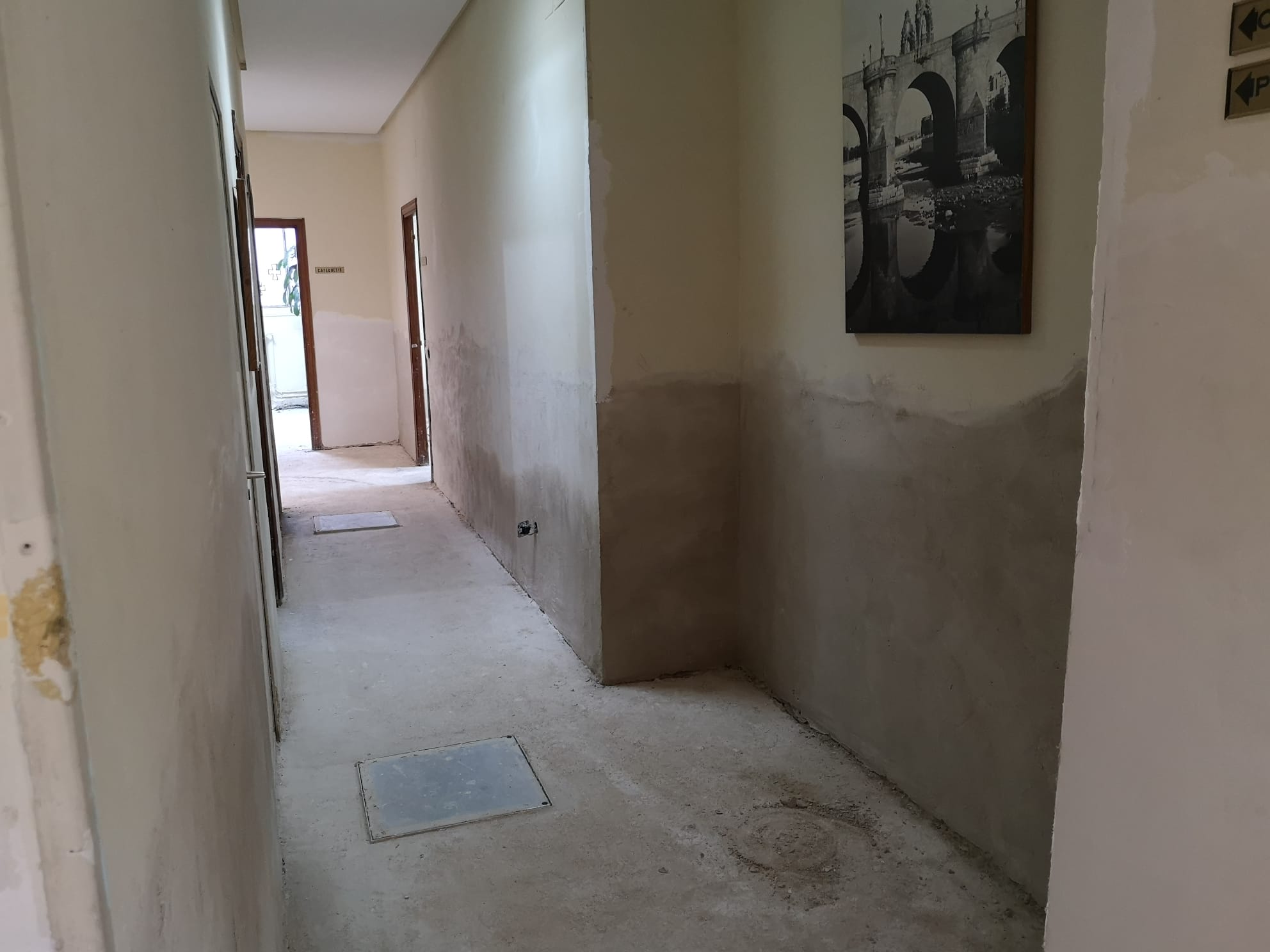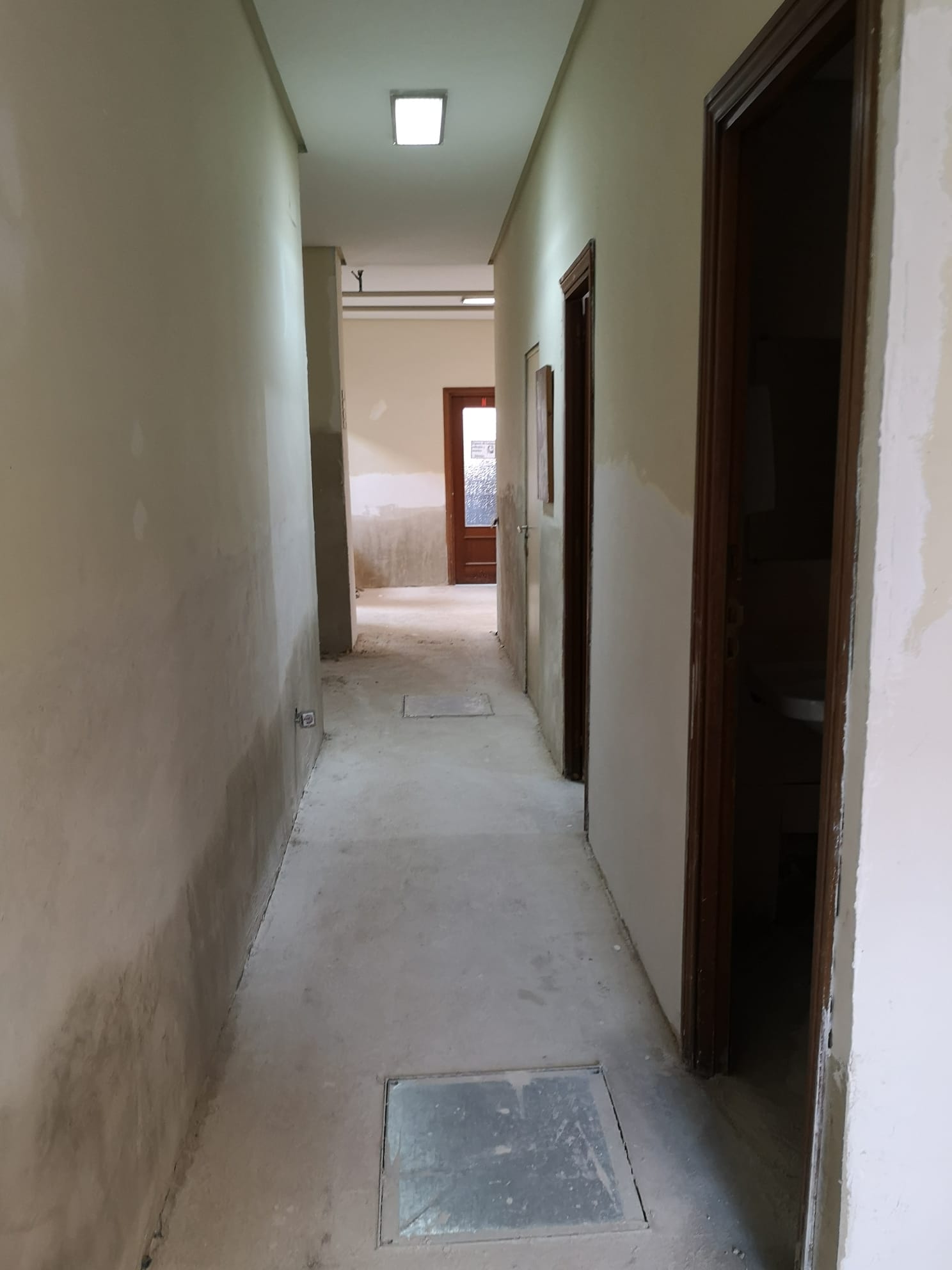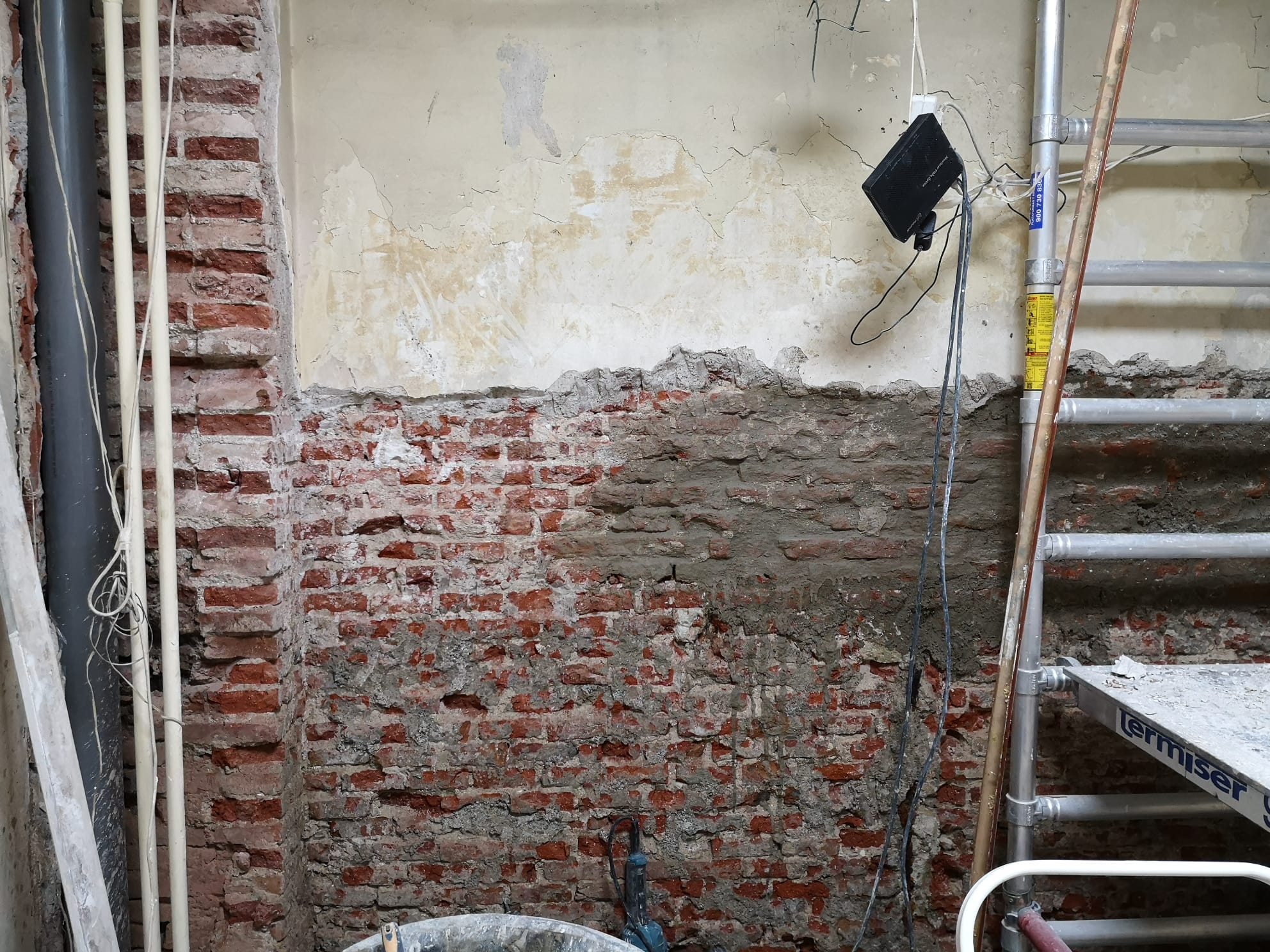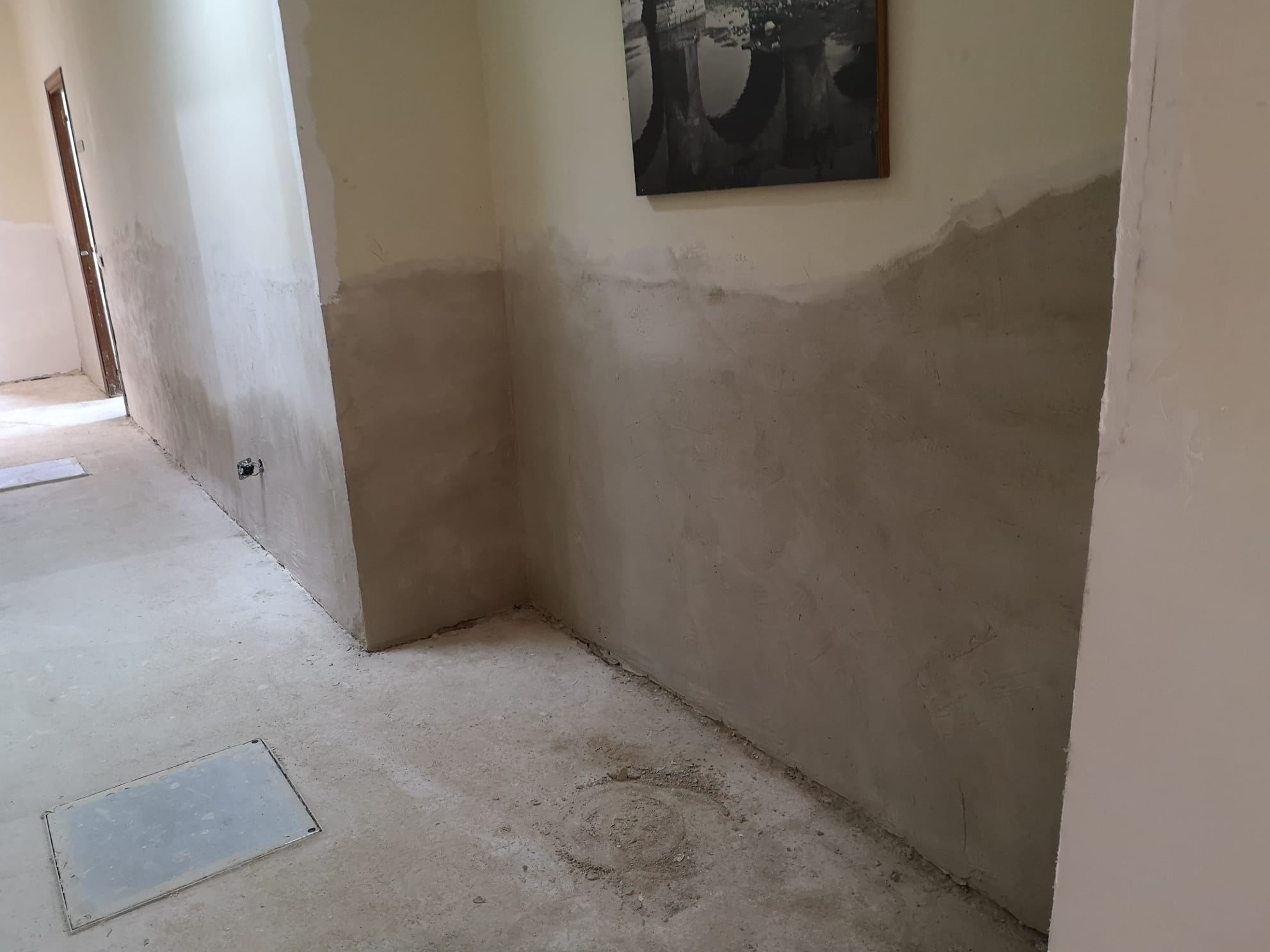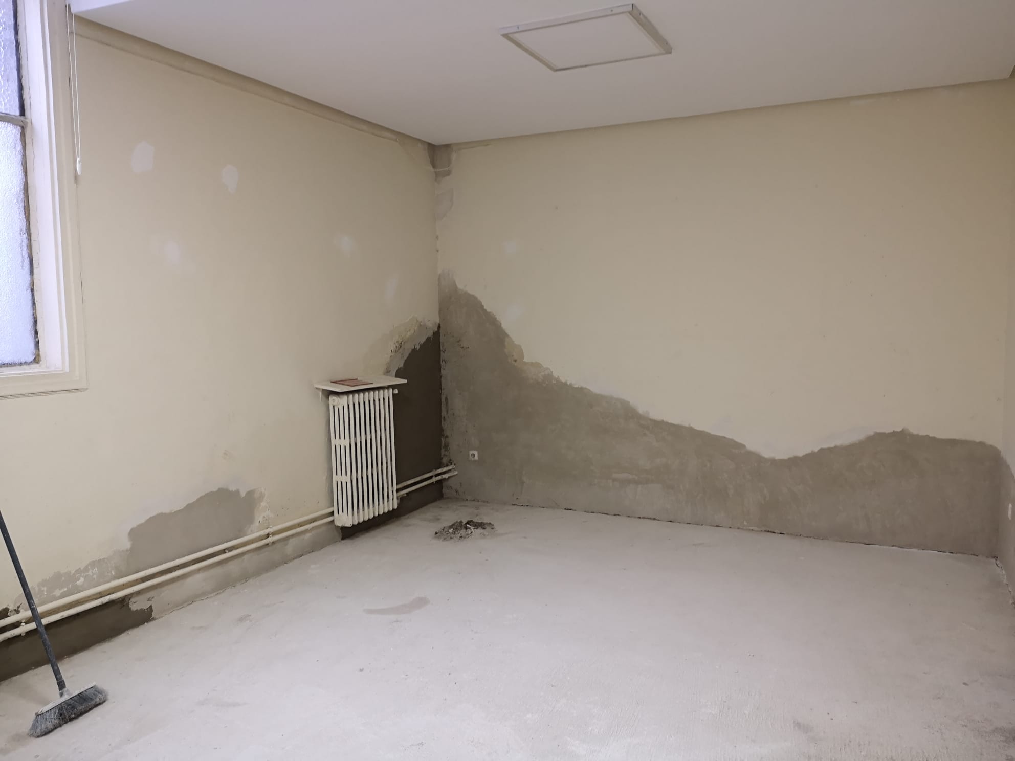 - Las paredes deterioradas por la humedad se están arreglando, quitándose el azulejo que se estaba cayendo, enyesando o rellenando con cemento, y se han hecho trampillas de control y ventilación, de modo que están preparadas para pintura.