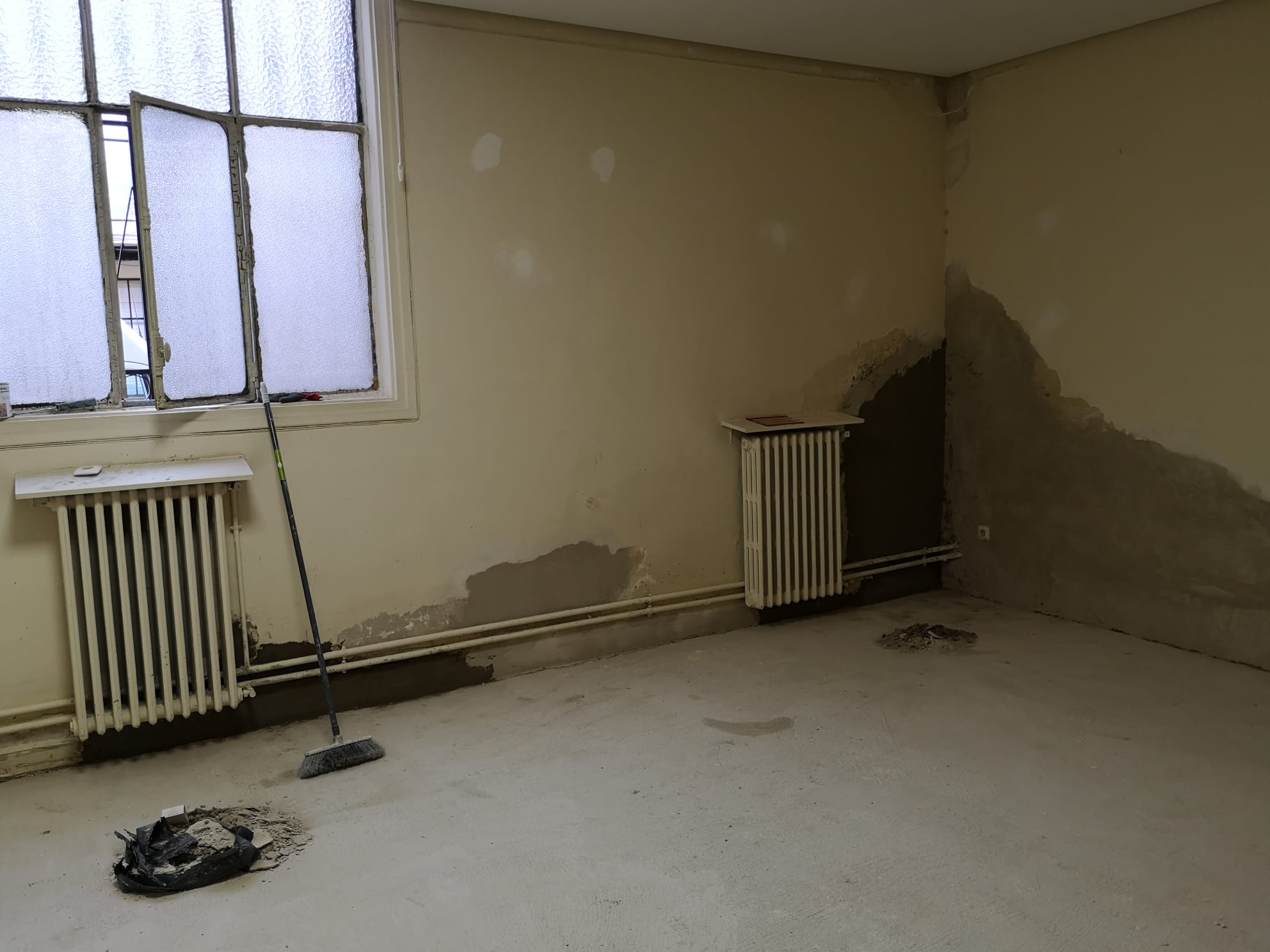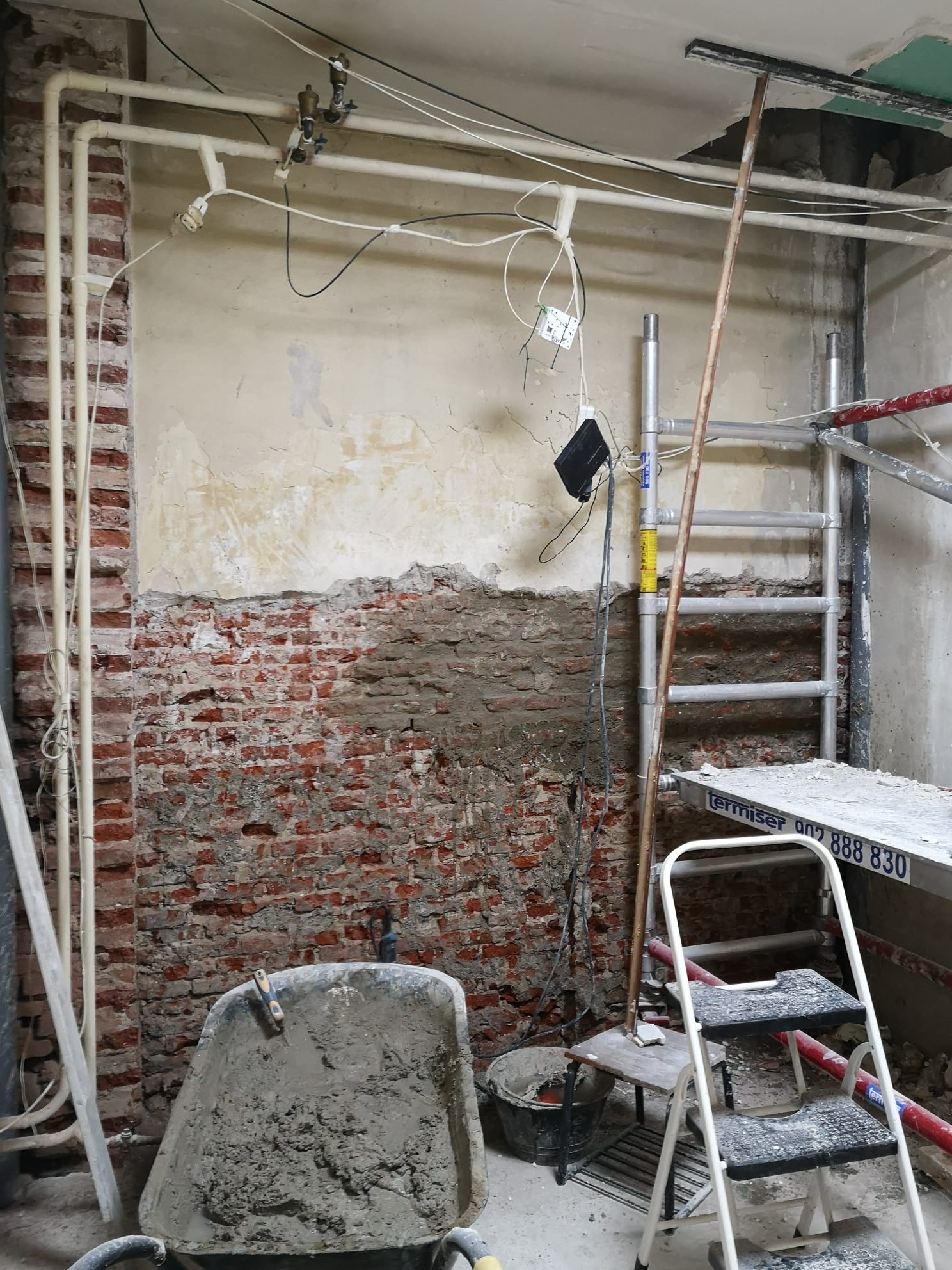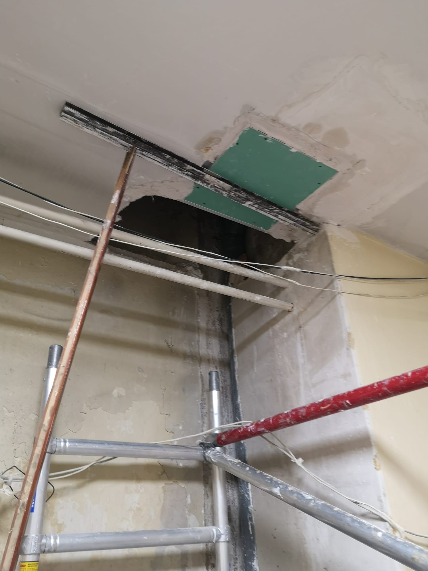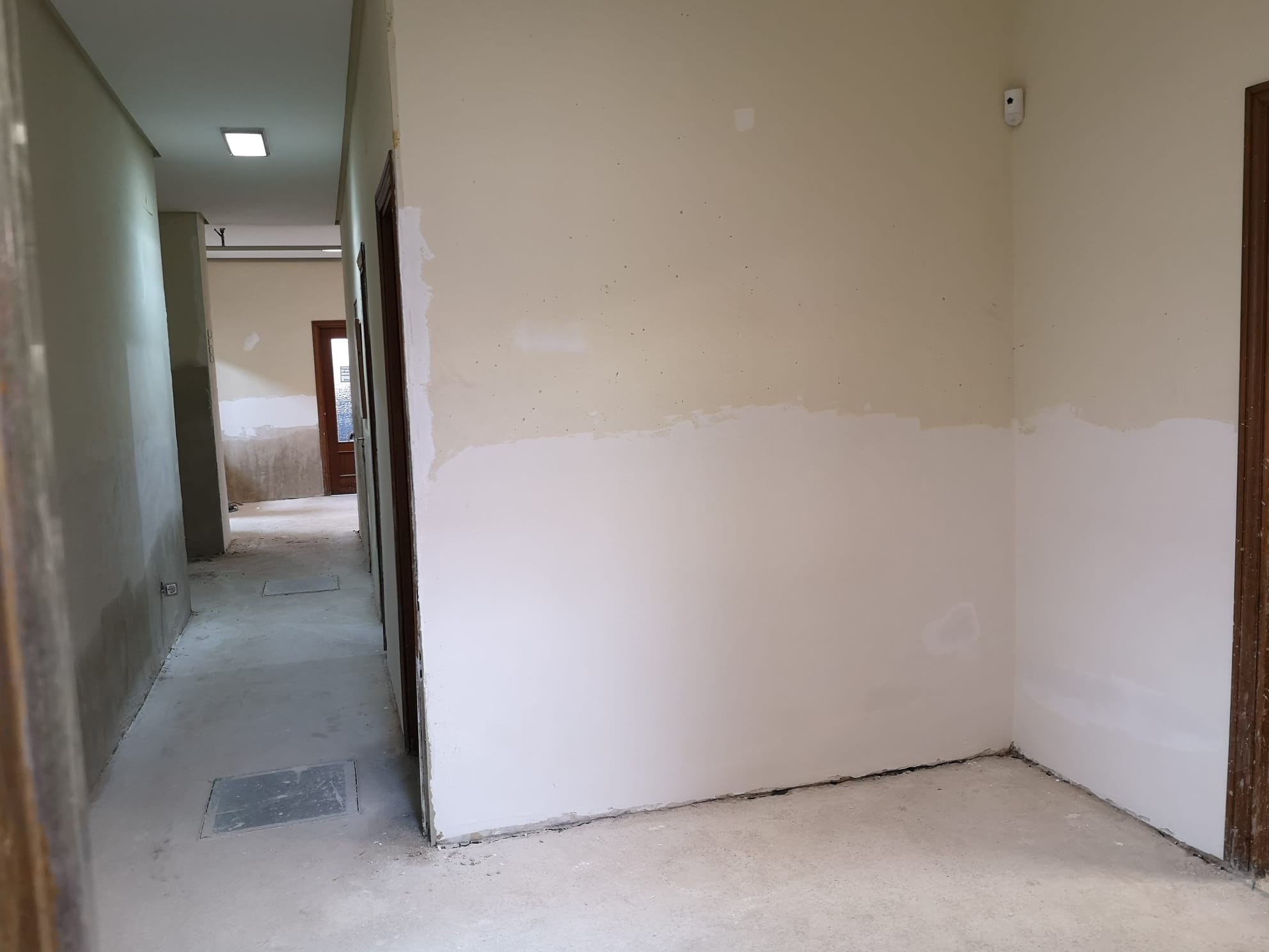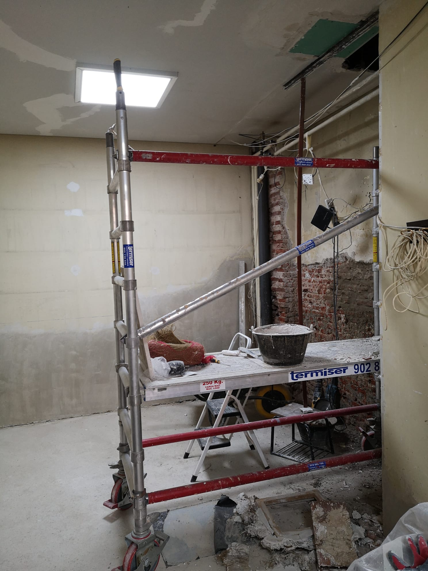 - Las paredes deterioradas por la humedad se están arreglando, quitándose el azulejo que se estaba cayendo, enyesando o rellenando con cemento, y se han hecho trampillas de control y ventilación, de modo que están preparadas para pintura.