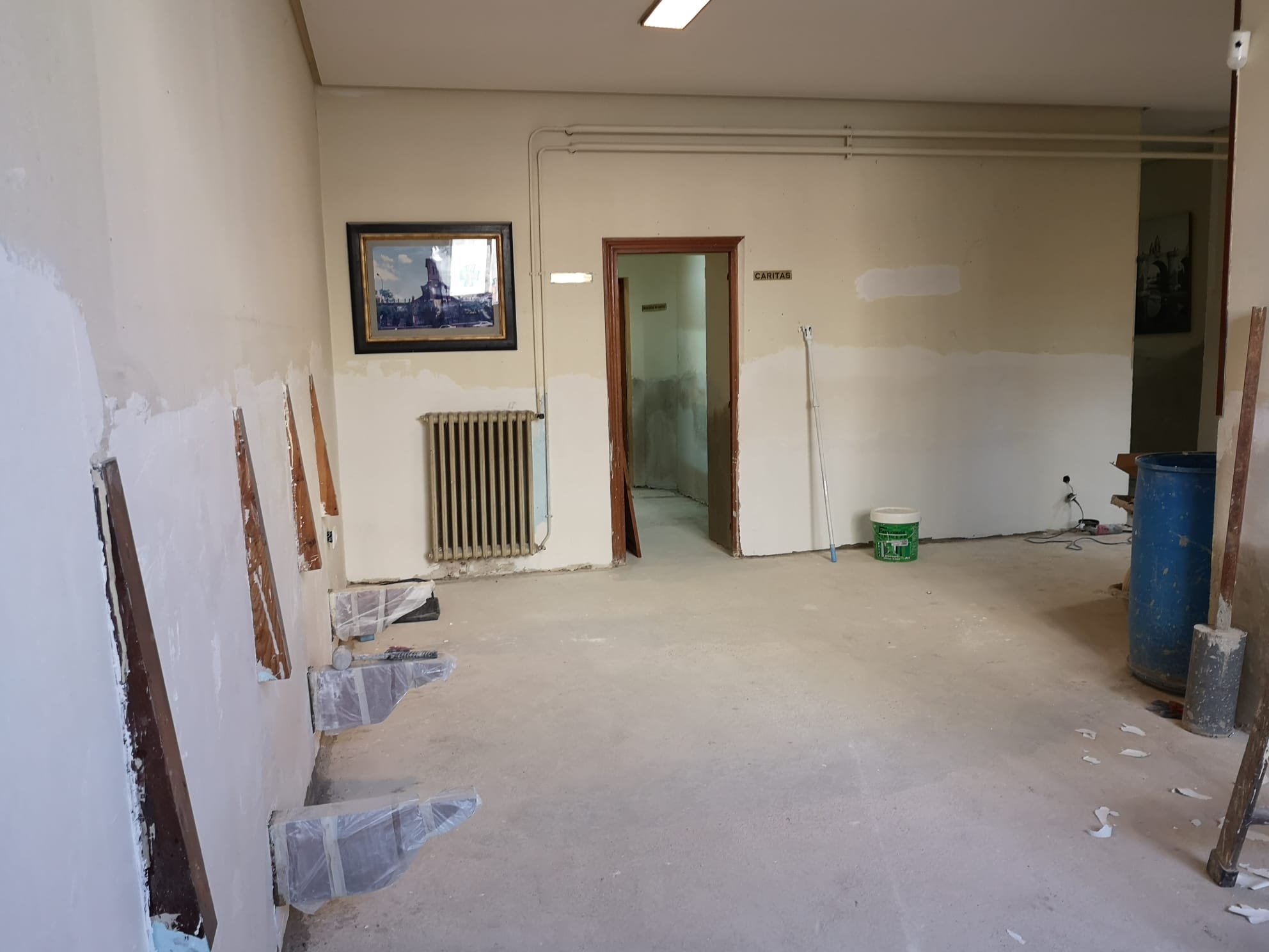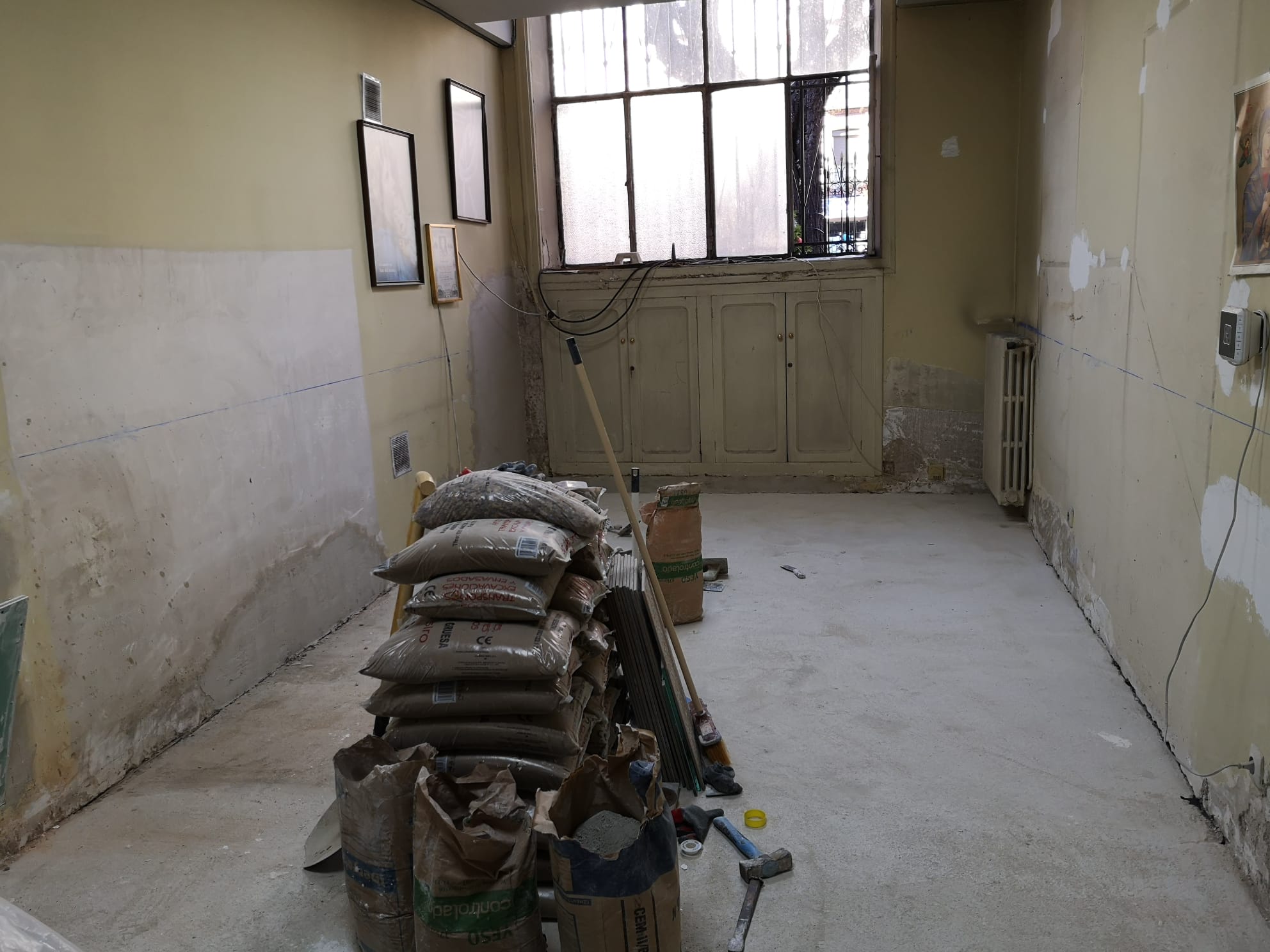 - en los locales de secretaría hemos encontrado los suelos en muy mal estado (sobre vacío), de modo que ha habido que rellenar buena parte del subsuelo con hormigón, cortar las raíces de los árboles que los estaban levantando. Y se están igualando y preparando los suelos para poner la baldosa nueva.